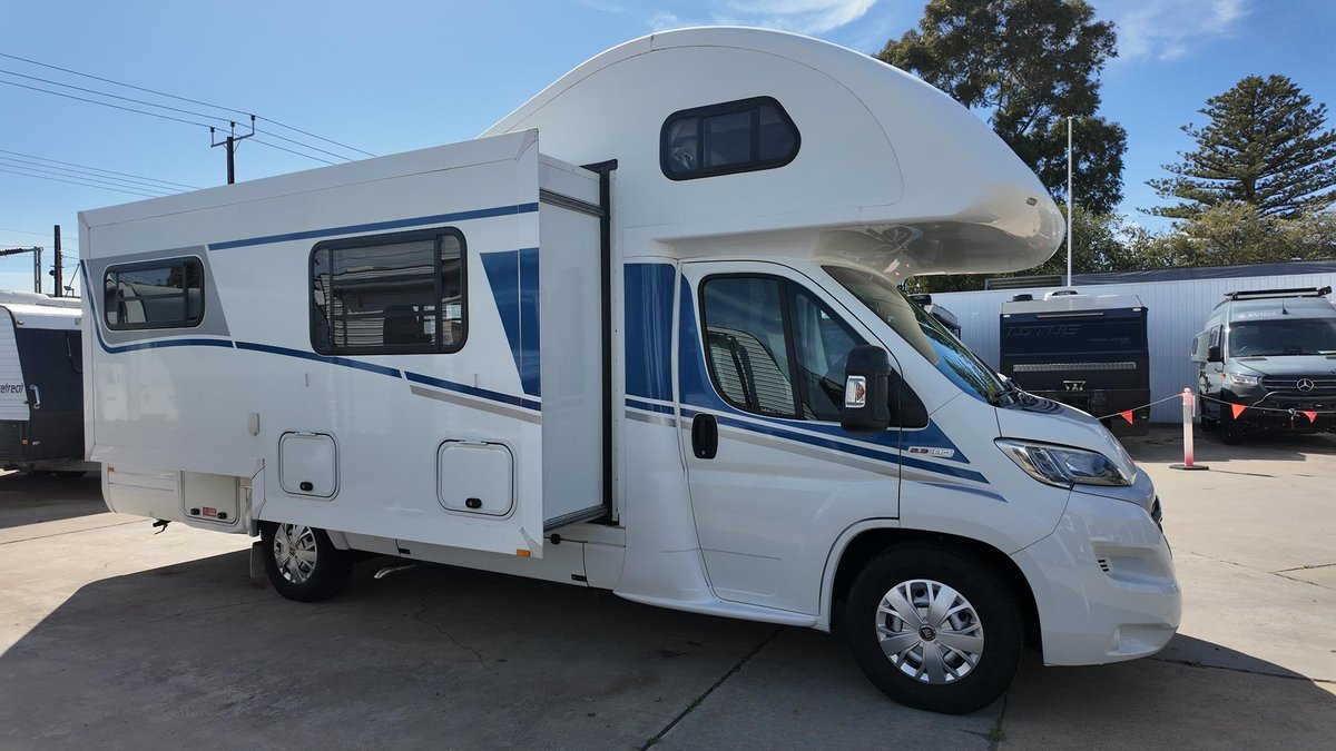 The 2018 Avida Birdsville is a C-Class motorhome built on a Fiat Ducato chassis, featuring a 2.3L turbo diesel engine and automatic transmission, requiring a standard car licence to operate. It offers a standard-equipped kitchen, a slide-out for increased living space, and an integrated ensuite with toilet and shower. Key specifications include a 4400kg Gross Vehicle Mass (GVM), 124L fresh and grey water tanks, and interior features such as a café dinette, gas and electric cooktop, and a 190L fridge/freezer.